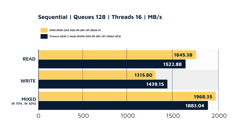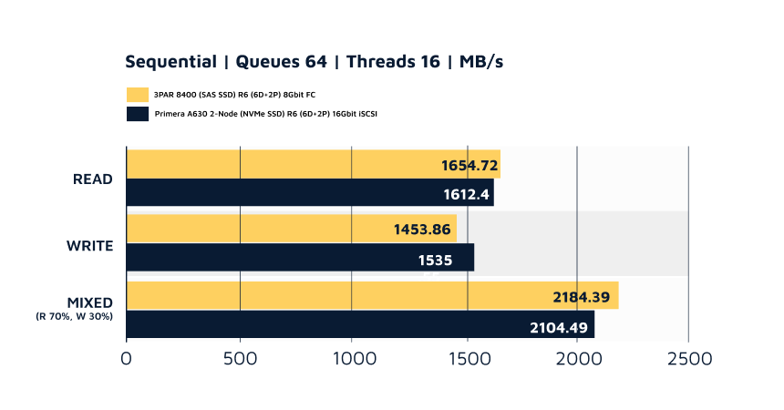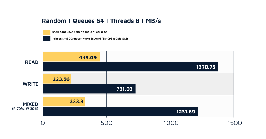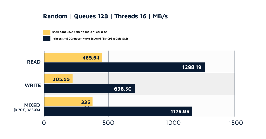The results show the HPE Primera A630 with all-flash NVMe SSDs delivers far superior ‘random’ I/O performance across the board—random reads, random writes, and mixed workloads, which is a huge performance gain for small file workloads like;